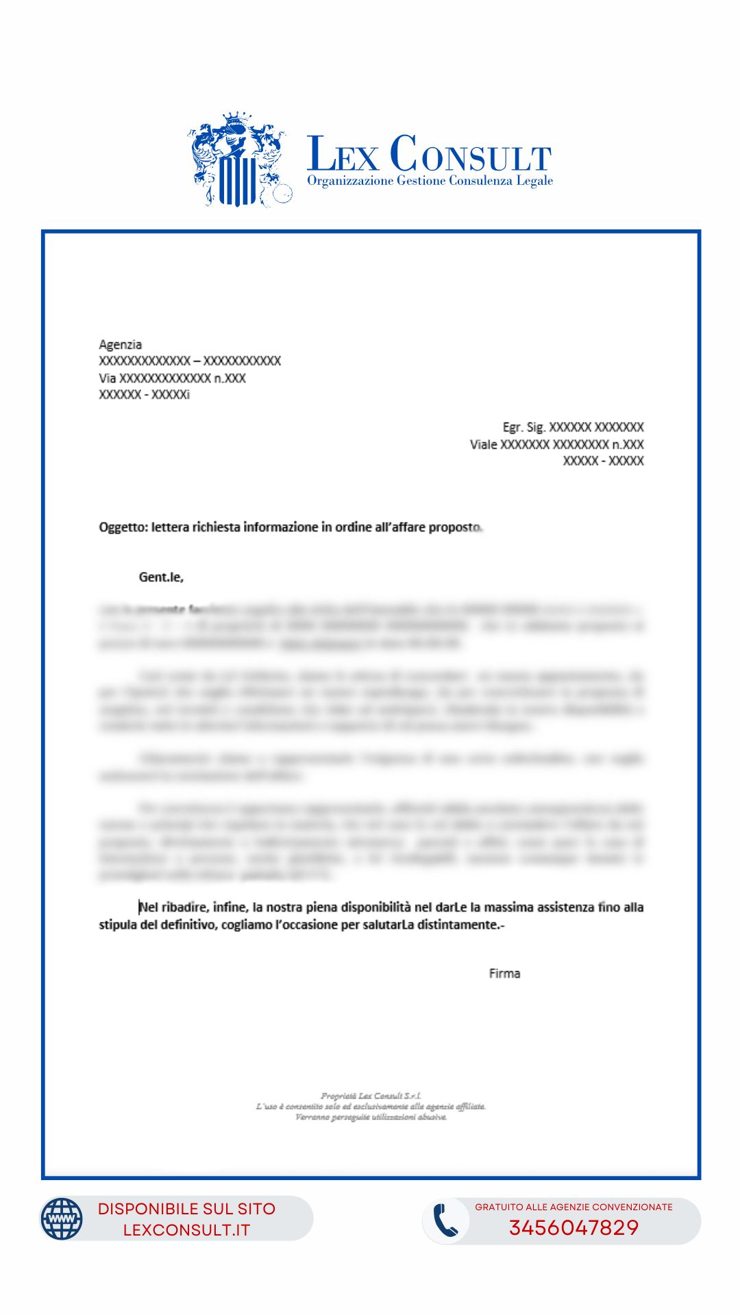 Quando deve essere utilizzato: il modulo consiste in una comunicazione che deve essere inviata al cliente che ha visionato l'immobile, senza aver firmato la scheda di visita, per precostituirsi la prova dell'avvenuta visita e dell'avvenuta instaurazione delle trattative. Attraverso questo modulo si crea la prova che l'immobile è stato proposto dall'agenzia e si mette a conoscenza il cliente dei rischi che corre nell'ipotesi in cui tenta di escluderla dalle trattative.€ 99,00Gratuito per i convenzionati -